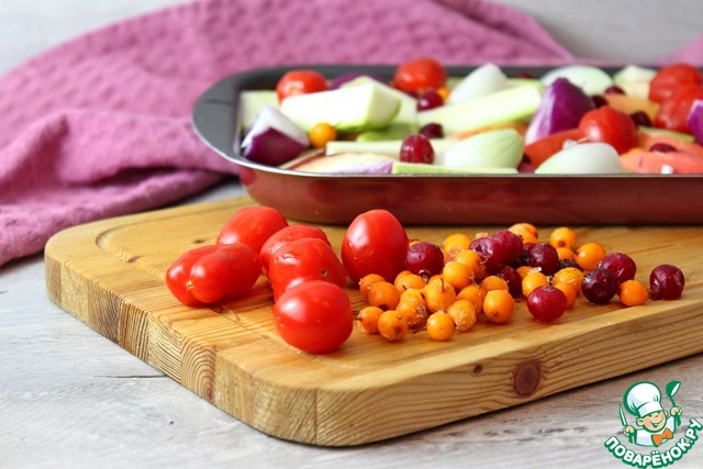 Томаты черри помыть, выложить хаотично в форме для запекания с другими ингредиентами для гарнира. Также добавить, не размораживая, свежезамороженные ягоды облепихи и клюквы.