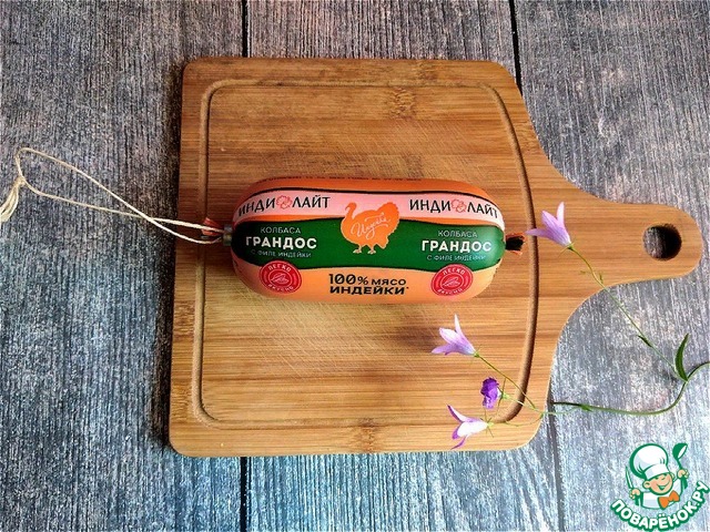В рецепте я буду использовать колбасу ТМ ИНДИЛАЙТ Грандос из 100 % мяса индейки. Она очень вкусная.