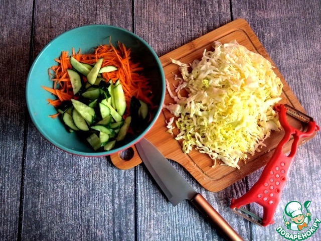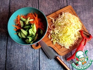 Капусту тонко шинкуем. Морковь натираем на тёрке, только не мелкой. Огурец нарезаем тоже, как вам нравится. Отправляем овощи к колбасе, капусту - последней.