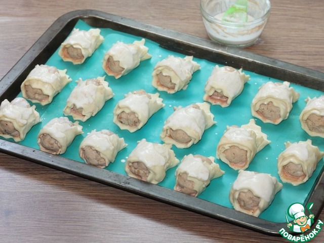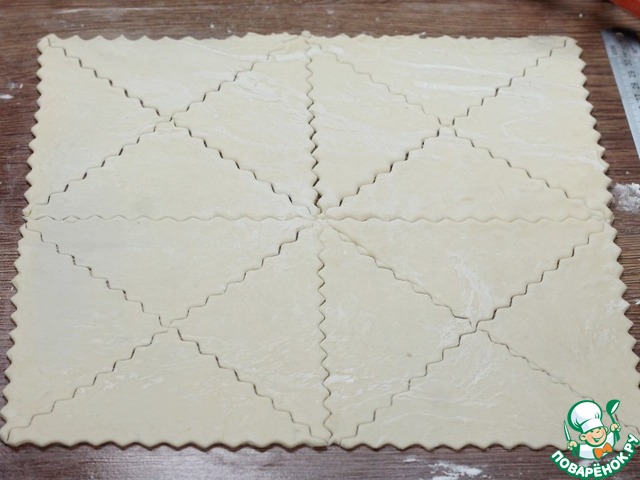 14. Выпекаем слойки в разогретой духовке, минут 25 или до готовности. Затем смазываем слойки взбитым желтком и на 5 минут в духовку до румяной корочки.