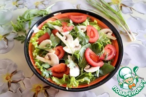 • Шампиньон, он у меня большой, нарезать тонкими слайсами. Посолить, посыпать сахаром и полить соком лимона. Пусть постоит минут 10 и промаринуется.