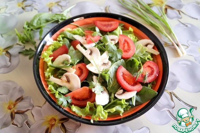 • На широкую тарелку разложить зелень - листья салата, кинзу, шпинат, рукколу, мяту, зеленый лук, гороховые молодые стебельки.