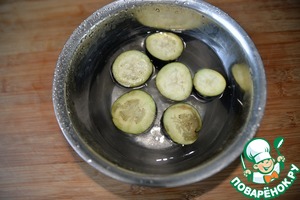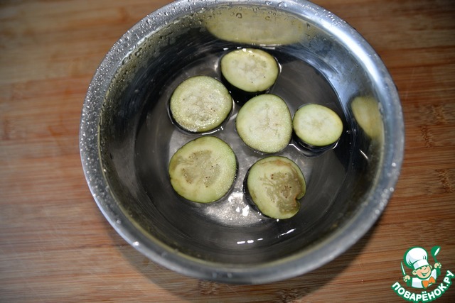 Я делала половину указанного количества. Идеально брать длинные тонкие баклажаны. Баклажаны моем, режем кружками толщиной 2-3 см. Заливаем солёной водой. 1 ст. ложка соли на 1 л воды. Это необходимо, чтобы вышла горечь. Осталяем на 20 минут. Далее воду сливаем, баклажаны обсушиваем.