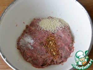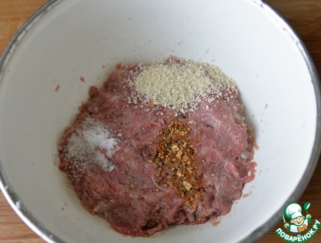 Добавляем в фарш панировочные сухари, соль, смесь перцев, тщательно вымешиваем, отбиваем.