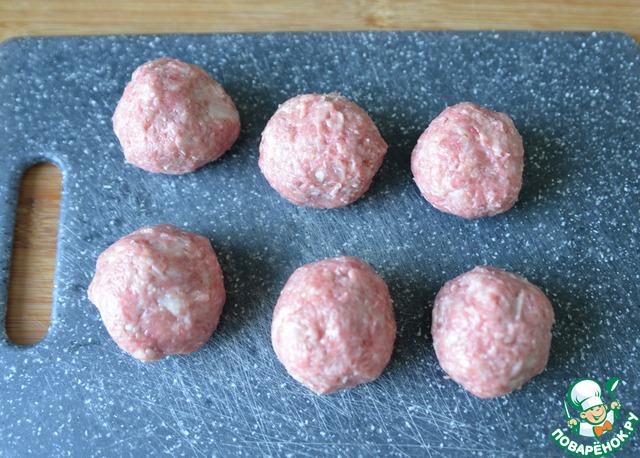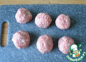 Мокрыми руками из получившегося фарша формируем фрикадельки. По размеру они должны примерно соответствовать диаметру баклажановых кружочков.