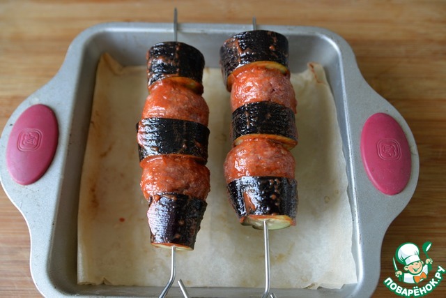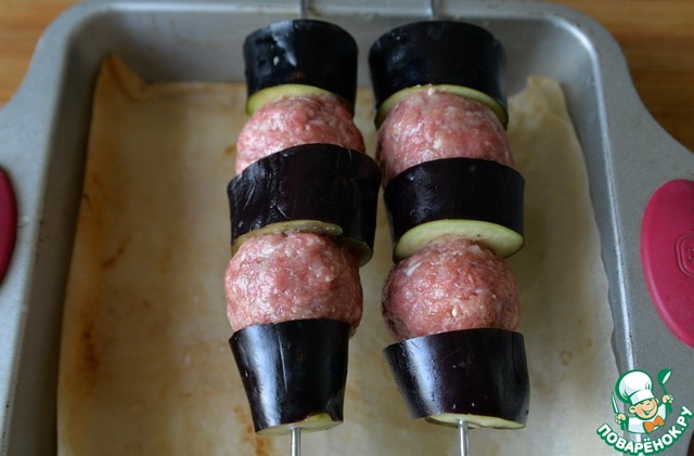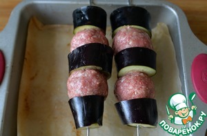 Берем шампура и нанизываем поочередно баклажаны и мясные шарики. На длинных шампурах, конечно, получится больше.