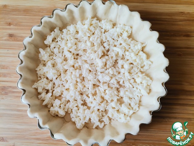 • Дно пирога посыпьте тертым сыром моцарелла.