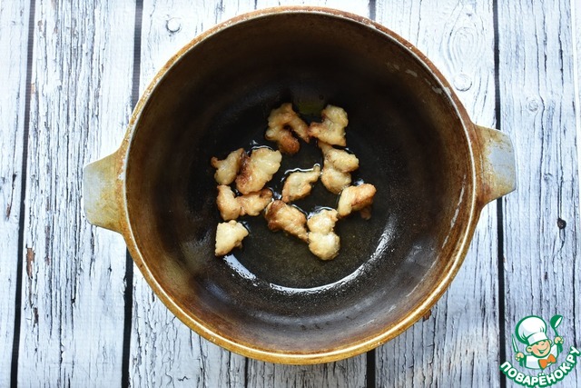 Казан ставим на огонь и нагреваем. Выкладываем курдючный жир и вливаем пару столовых ложек воды. После того как кусочки курдючного жира поджарятся с одной стороны, переворачиваем их и продолжаем топить. Не следует их сильно жарить, они должны стать слегка золотистыми.