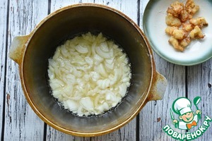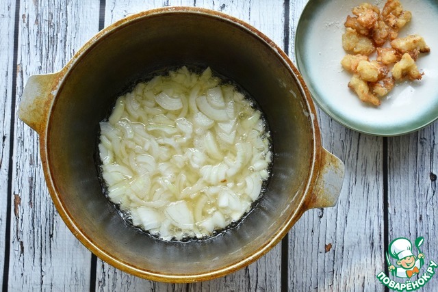 Разогреть казан до появления над маслом сизого дымка и выложить нарезанный полукольцами лук. -