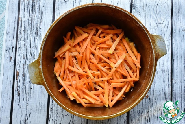 После того как выпарится вся влага, выделившаяся из мяса, перекладываем в казан нарезанную соломкой морковь.