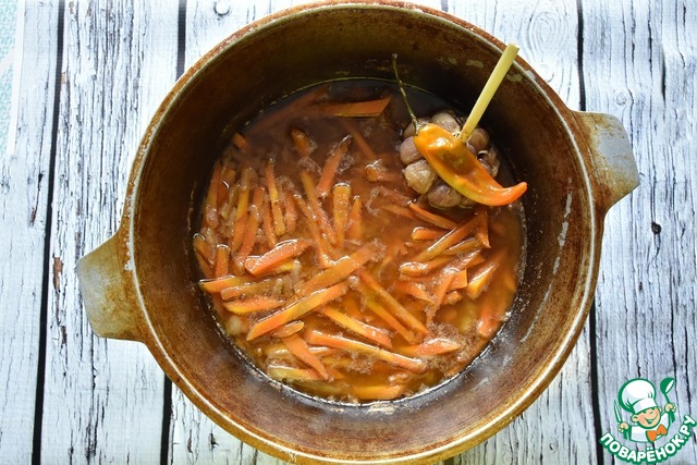 Опускаем в морковь очищенную от верхнего слоя шелухи головку чеснока и острый перчик целиком. Заливаем горячей водой так, чтобы вода покрыла овощи и мясо. Обязательно добавляем соль.