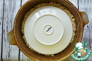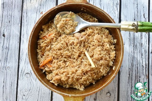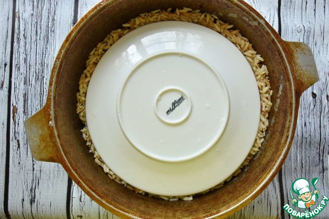 Когда жидкость в процессе кипения сравняется с уровнем риса, шумовкой перемещаем рис от стенок к центру. Уменьшаем огонь. Возвращаем головку чеснока и перчик. Проделываем деревянной палочкой отверстия до дна казана. Накрываем горку из риса тарелкой.
