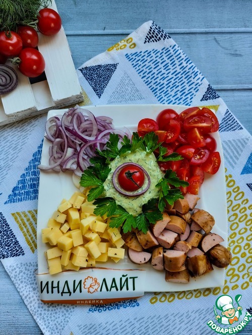 Очень сочный и незаезженный вариант салата. Сосиски приготовленные на мангале, сыр, помидоры и легкая заправка разнообразят Ваш пикник.