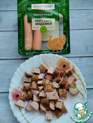 Я доводила сосиски до состояния готовности на раскаленных углях. Так же их можно обжарить на сковороде. Остывшие сосиски режем на квадратики как на фото.