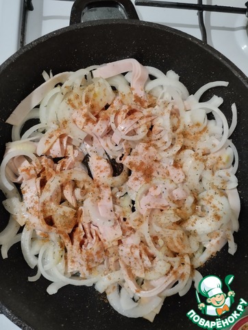 Ветчину и лук выкладываем на раскаленную с маслом сковороду, посыпаем приправой. Жарим переодически помешивая, на среднем огне до прозрачности лука.