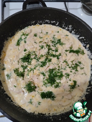 Масса сразу же начинает густеть и мы вливаем сливки, добавляем соль и мелко порубленную зелень укропа. Пропаривсем буквально в течении 1 минуты. Все, соус готов. Можно оставить его в изначально виде, либо как я при помощи блендера сделала однородную консистенцию.