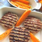 Пока овощи запекаются, начинаем жарить котлеты на гриль-сковороде или на гриле... на том, что у вас есть на даче. Визуально делим фарш на 4 части. Котлеты будем формировать довольно крупные. Ставим сковороду-гриль на огонь, смазываем маслом её рёбра, нагреваем. Влажными ладонями формируем из фарша котлету и сразу же выкладываем её на сковороду. Так же поступаем с остальным фаршем. В центре каждой котлеты ложкой сделаем небольшое углубление. Так котлеты у нас при жарке не поднимутся, а будут ровные и красивые в полосочку. Жарим до готовности и желаемой румяности. Котлеты с добавлением яблока получаются сочными и с пикантной вкусовой ноткой.