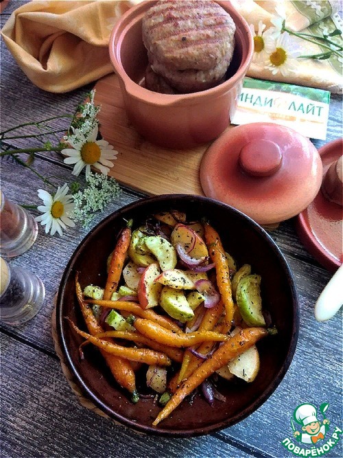 Котлеты с индейкой с добавлением яблока к запечённым пряным овощам: молодой моркови; кабачку с луком и чесноком и яблоку. Продёрнули морковку на грядке, не выбрасывайте даже если она очень мелкая. Такую морковь хорошо запечь с пряными травами. Очень душевно!