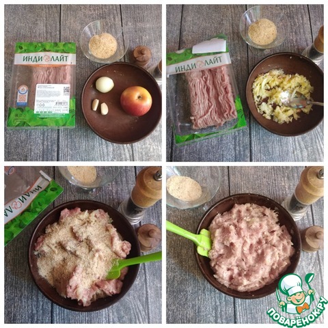 Делаем котлеты из готового фарша из индейки ТМ ИНДИЛАЙТ. В посуду натрём вначале луковицу и чеснок, затем - половинку яблока сладкого. Так яблоко у нас не потемнеет, не даст лук. Выкладываем фарш, соединяем. Солим и перчим по вкусу и добавляем сухари. Вымешиваем фарш. Я вымешивала вначале силиконовой лопаткой, а затем руками. Пусть фарш немного постоит и ингредиенты в нём "подружатся".