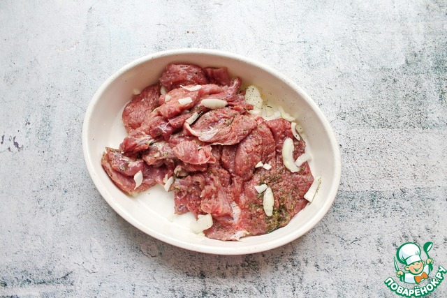 Филе индейки с помощью острого ножа раскройте в пласт, слишком толстые места срежьте. Все мясо отбейте, посолите, поперчите и положите в миску. Репчатый лук, чеснок порежьте мелко и добавьте к индейке, влейте уксус, посыпьте сушёной зеленью, перемешайте и оставьте на один час.