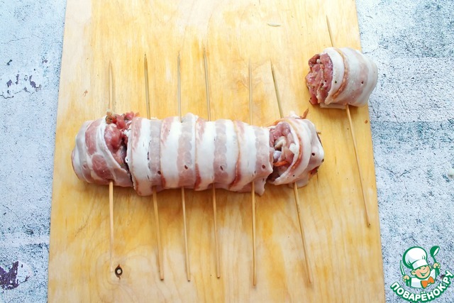 Деревянным шпажками проткните рулет насквозь в середине каждой полоски бекона. Острым ножом разрежьте рулет между шпажками.