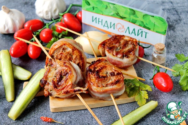Деревянным шпажками проткните рулет насквозь в середине каждой полоски бекона. Острым ножом разрежьте рулет между шпажками. |