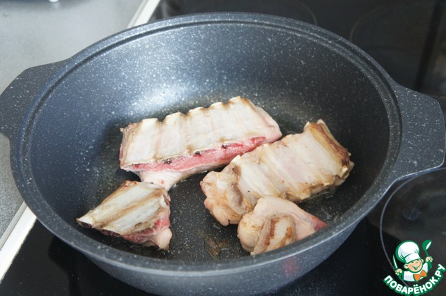 На небольшом количестве сливочного масла обжариваем рёбрышки до золотистой корочки с каждой стороны. Заливаем водой - около 2 литров.