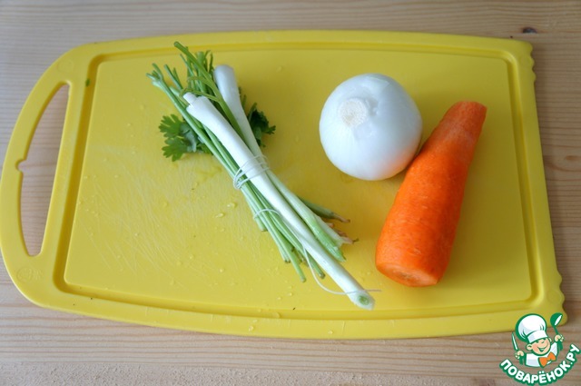 Стебельки зелени связываем нитью и отправляем в кастрюлю вместе с морковью и луком. Добавляем несколько горошин чёрного перца.