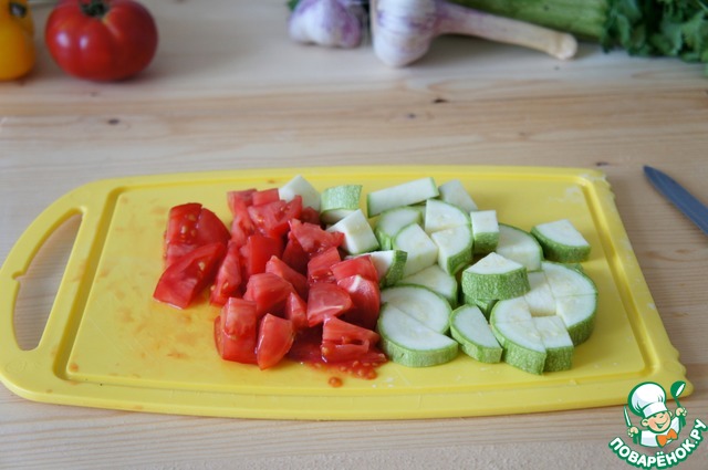 Режем молодой кабачок и большой помидор. Отправляем к рёбрышкам, варим до готовности, минут 10. Мне нравится, когда овощи хорошо развариваются, я варю ещё чуть дольше.