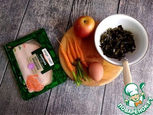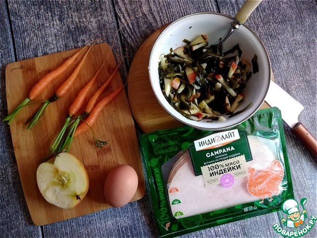 Баночку салата из морской капусты нужно открыть, откинуть на дуршлаг, чтобы стекла вся жидкость, по желанию промыть. Я не промывала. Можно взять и капусту наразвес. Сейчас её продают в маркетах больших. Яйцо сварим вкрутую. Я буду в салате использовать ветчину из индейки в нарезке ТМ ИНДИЛАЙТ из 100 % мяса индейки CAMPANA. Морковь возьму молодую и половинку сладкого яблока.