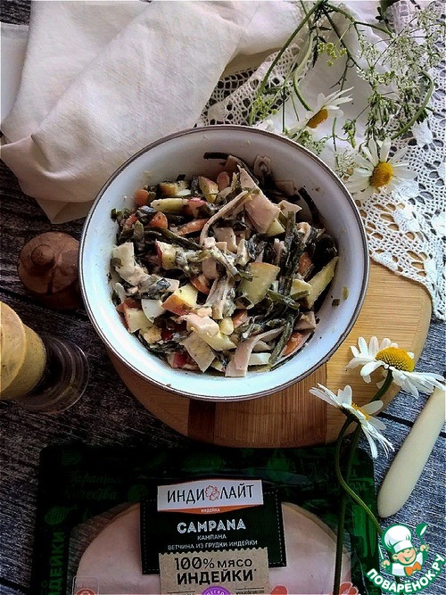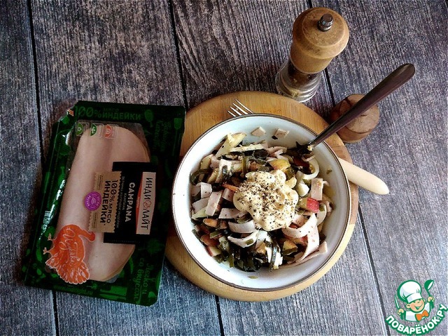 Я очень часто делаю салаты из морской капусты, но с ветчиной из индейки сделала впервые и не ошиблась. Какой же замечательный салат получился с небольшим содержанием наименований ингредиентов. А сколько пользы в нём! Всё в нём есть, что нам нужно для здоровья. Такой салат можно приготовить и не только на природе.