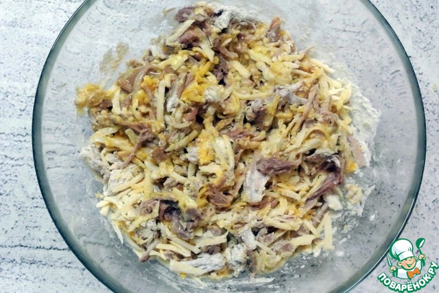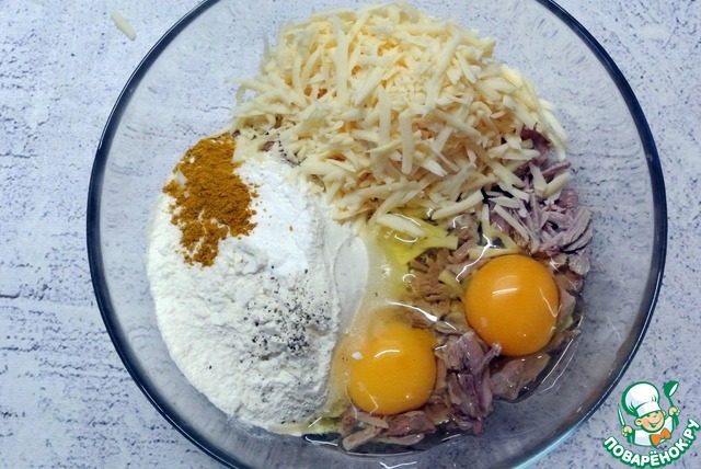 К разобранному мясу индейки всыпать просеянную муку, соль, карри, черный молотый перец, разрыхлитель.