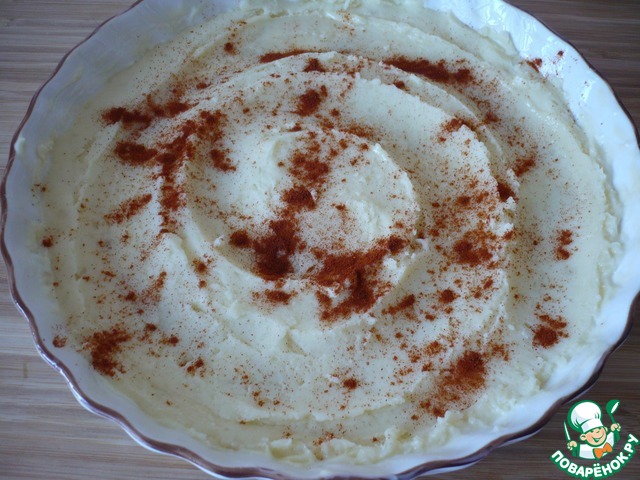 • Жаропрочную форму (d-28 см) смажьте сливочным маслом и выложите часть картофельного пюре. Сформируйте из картофельного пюре спиральную форму и посыпьте его сверху копченой сладкой паприкой.