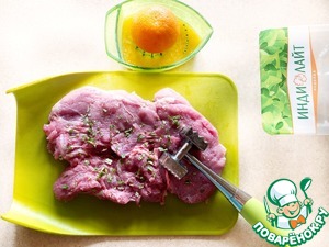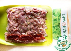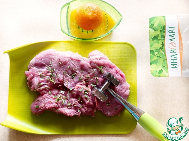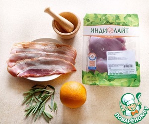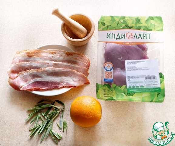 • Мясо индейки разрежьте "книжкой" и слегка отбейте с двух сторон. Немного присолите (не переборщите, т к бекон даст дополнительную соль), приправьте перцем и паприкой. Розмарин очень мелко порубите и распределите по поверхности мяса с двух сторон. Добавьте сок 1 апельсина. Дайте мясу постоять в маринаде в течение 1 часа (можно и больше).