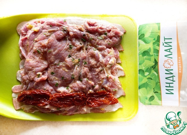 • На разделочную доску выложите внахлёст бекон, сверху - пласт мяса индейки (предварительно лишний сок с мяса промокните бумажным полотенцем) и по краю выложите вяленые томаты. Сверните в плотный рулет, воткните деревянные шпажки (предварительно замоченные на 15 мин в воде) и разрежьте рулет между шпажками на небольшие "шайбочки".