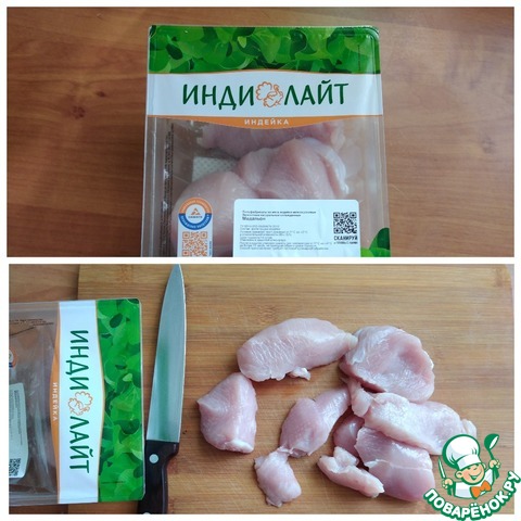 Для супа я буду использовать продукцию ТМ ИНДИЛАЙТ медальоны. Можно в этот суп взять и филе бедра, и филе грудки, рагу... - мякоть индейки. Я буду варить немного супа и использую 250 г. Порежу кусочками.