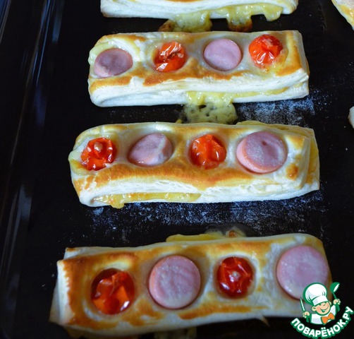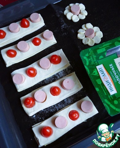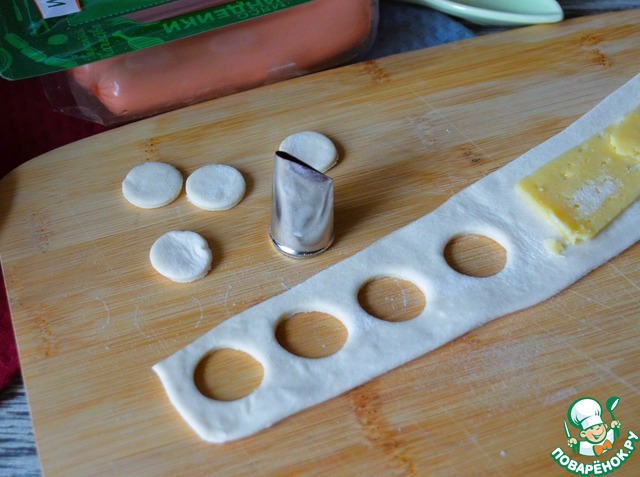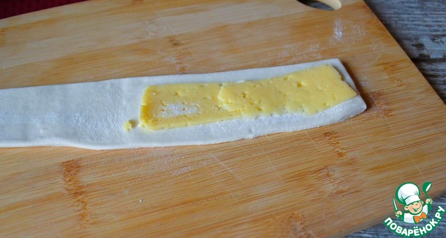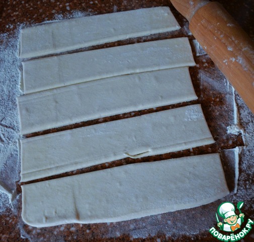 P.S.: не забываем, слоёное тесто раскатывать в одном направлении, удобно от центра вправо и влево. Разрезать на 5 полос. -