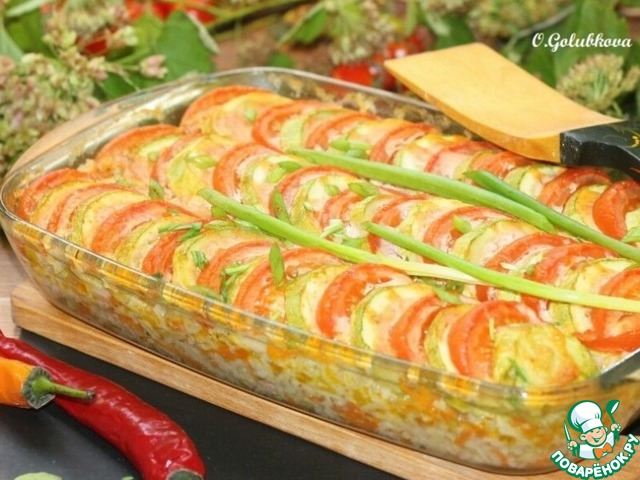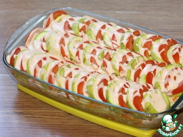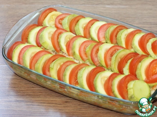 14. Раскладываем кружочки кабачков и дольки помидоров.