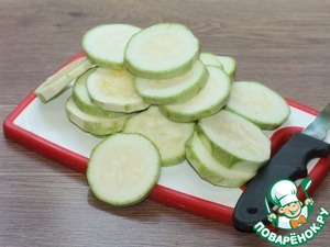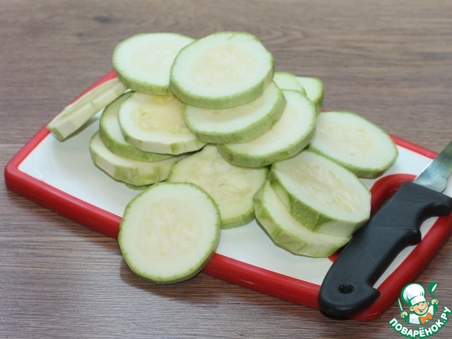 2. Кабачки (500 грамм) нарезаем кружочками, толщиной 0,5 см.