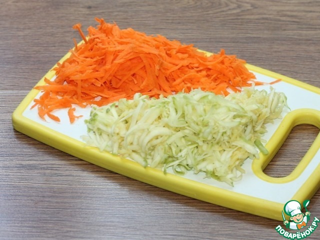 5. На крупной терке, натираем морковь и оставшиеся кабачки (300 гр).