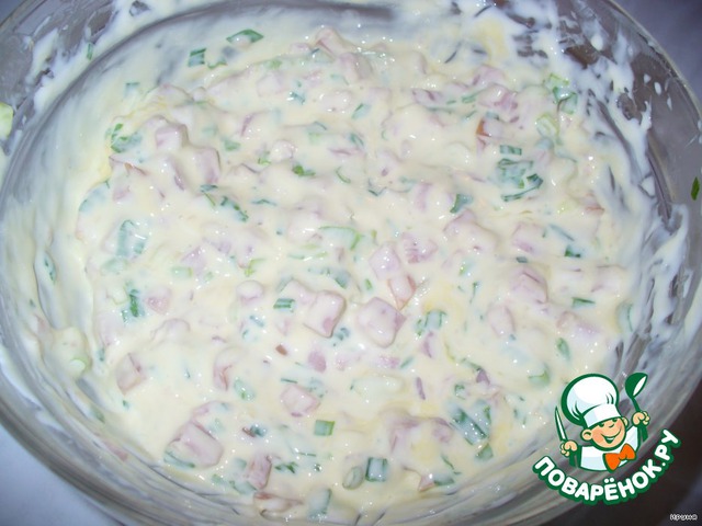 Ветчину нарезать маленькими кубиками, лук мелко нарезать.
