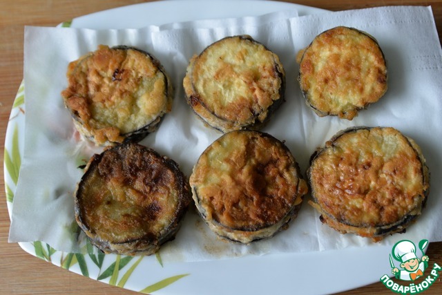 Кладём обжаренные баклажаны на бумажное полотенце, чтобы избавиться от излишков масла.