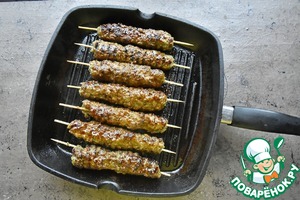 Разогреваю гриль на умеренно сильном огне. По необходимости смазываю сковороду растительным маслом. Выкладываю кебабы на горячий гриль и обжариваю переворачивая каждые 2-3 минуты.