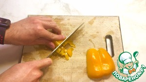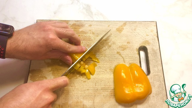 У болгарского перца вырезаем плодоножку и мякоть нарезаем небольшим кубиком.