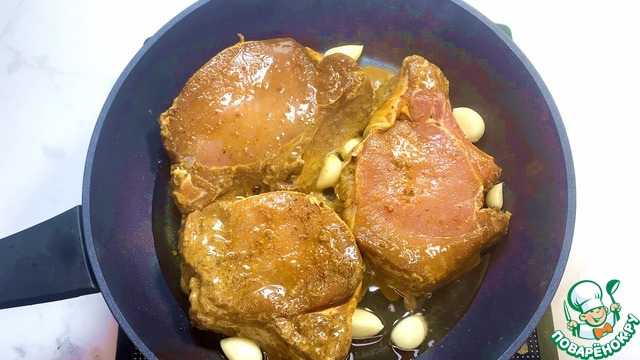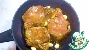 Затем на разогретую сковороду наливаем подсолнечное масло, туда же отправляем чеснок, кладем стейки и обжариваем их по 3 минуты с каждой стороны.