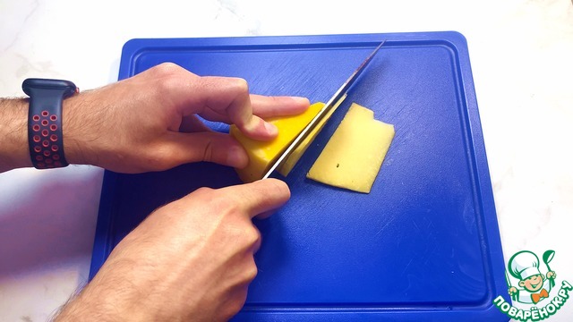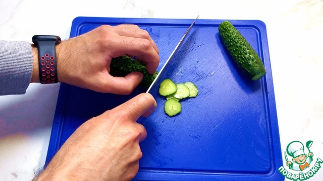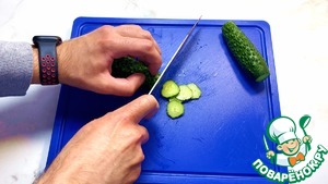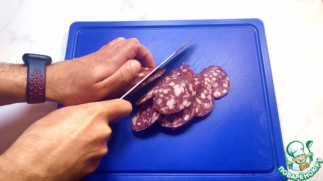 Сыровяленую колбасу нарезаем тонкими колечками.