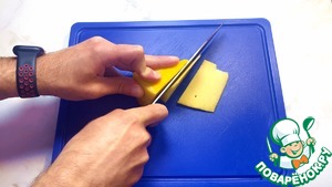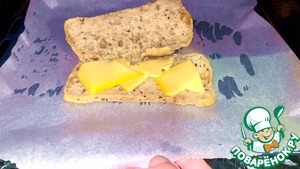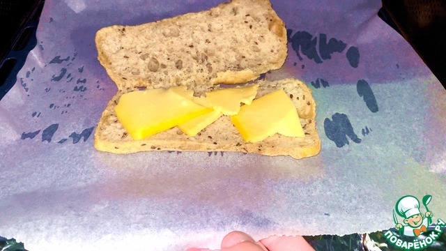 После чего чиабатту разрезаем на 2 половинки, кладем на неё сыр и отправляем в духовой шкаф, разогретый до 200 градусов на 5 минут.