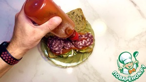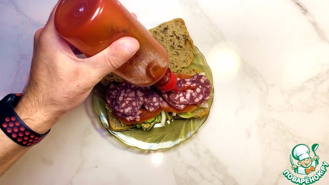 Поливаем сэндвич острым соусом, кисло-сладким соусом и накрываем второй половинкой чиабатты.