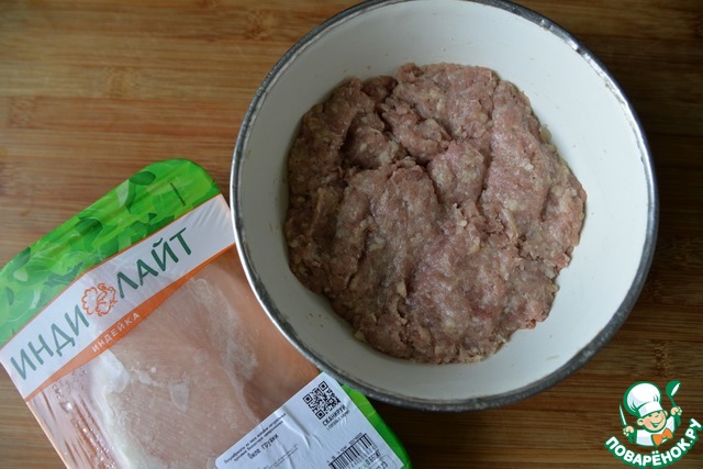 Для приготовления этого рецепта берём готовый фарш из индейки или перекручиваем в фарш любое филе индейки. У меня - филе грудки индейки "Индилайт".