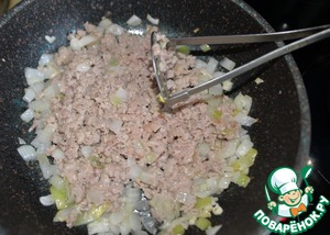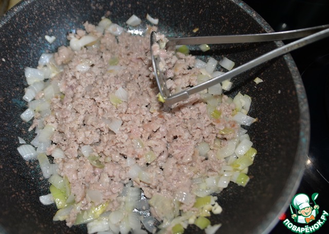 Перемешиваем, разминаем комочки. Я это делаю металлической толкушкой. Обжариваем на среднем огне фарш 10 минут.